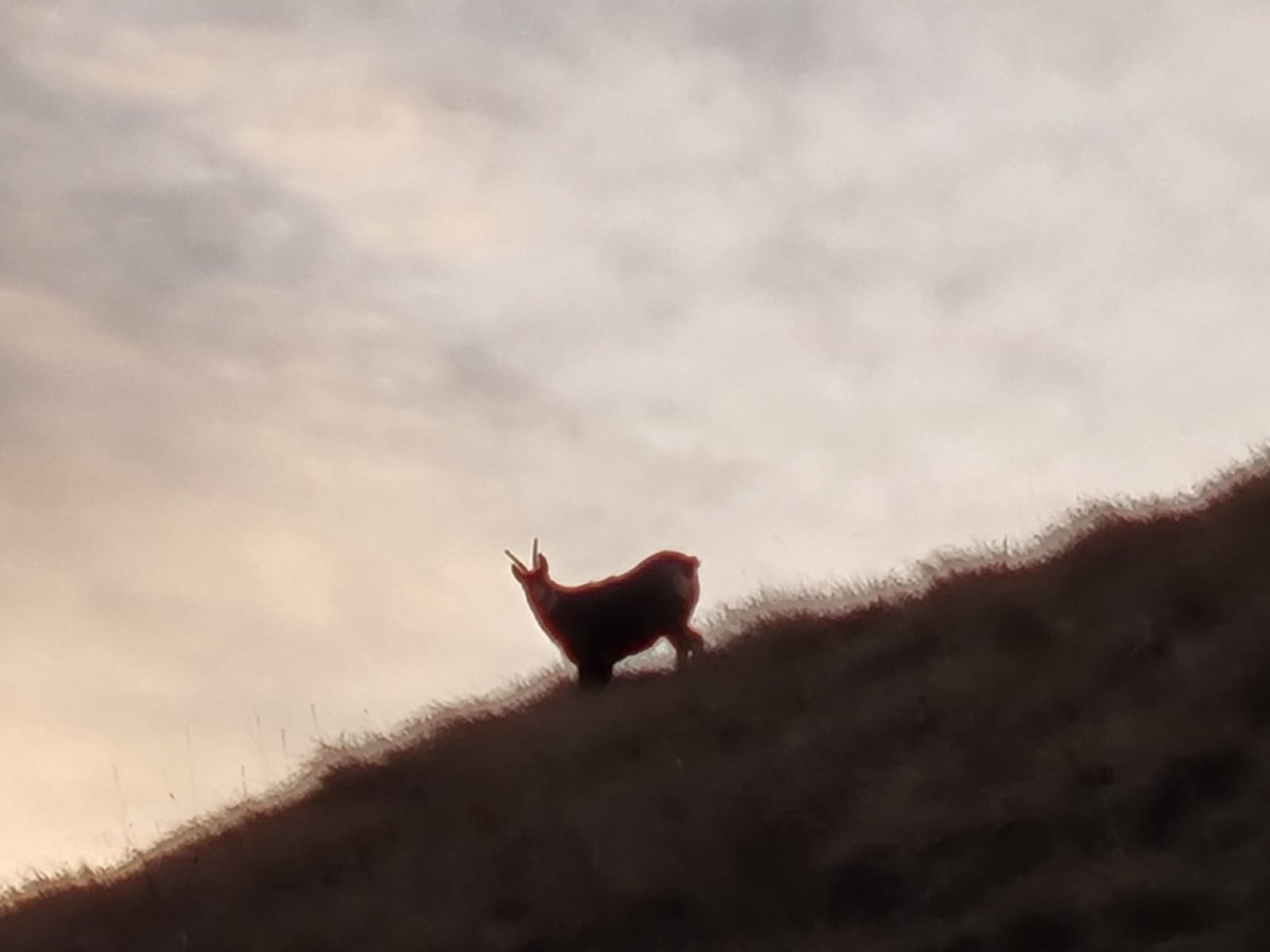 C’est alors qu’au détour du sentier, un mouvement discret a attiré notre attention. Un chamois se tenait là, immobile, son pelage d’hiver épais et soyeux, parfaitement adapté au froid à venir. Il nous observait avec cette curiosité tranquille, ses yeux sombres et intelligents fixés sur nous.