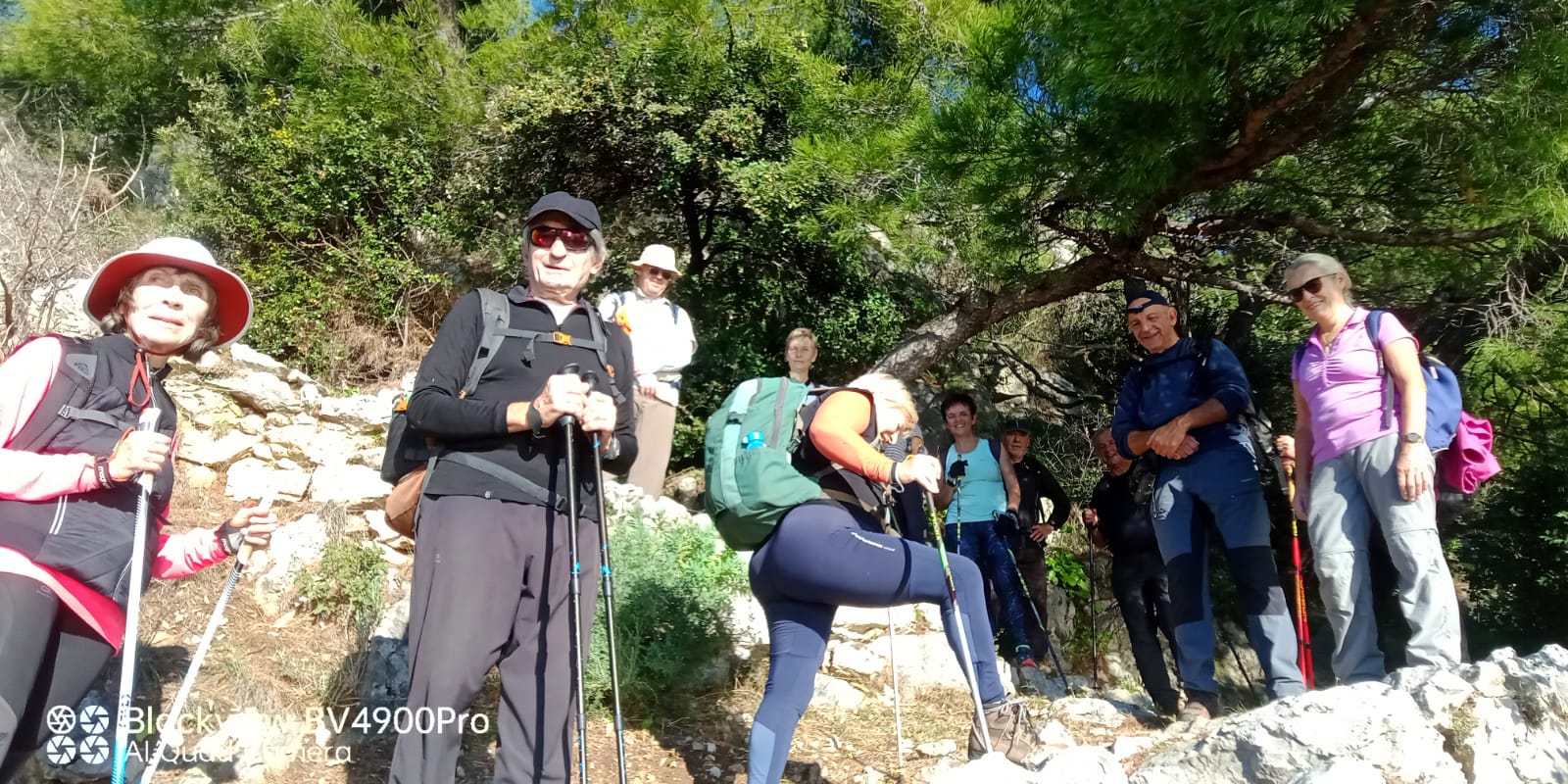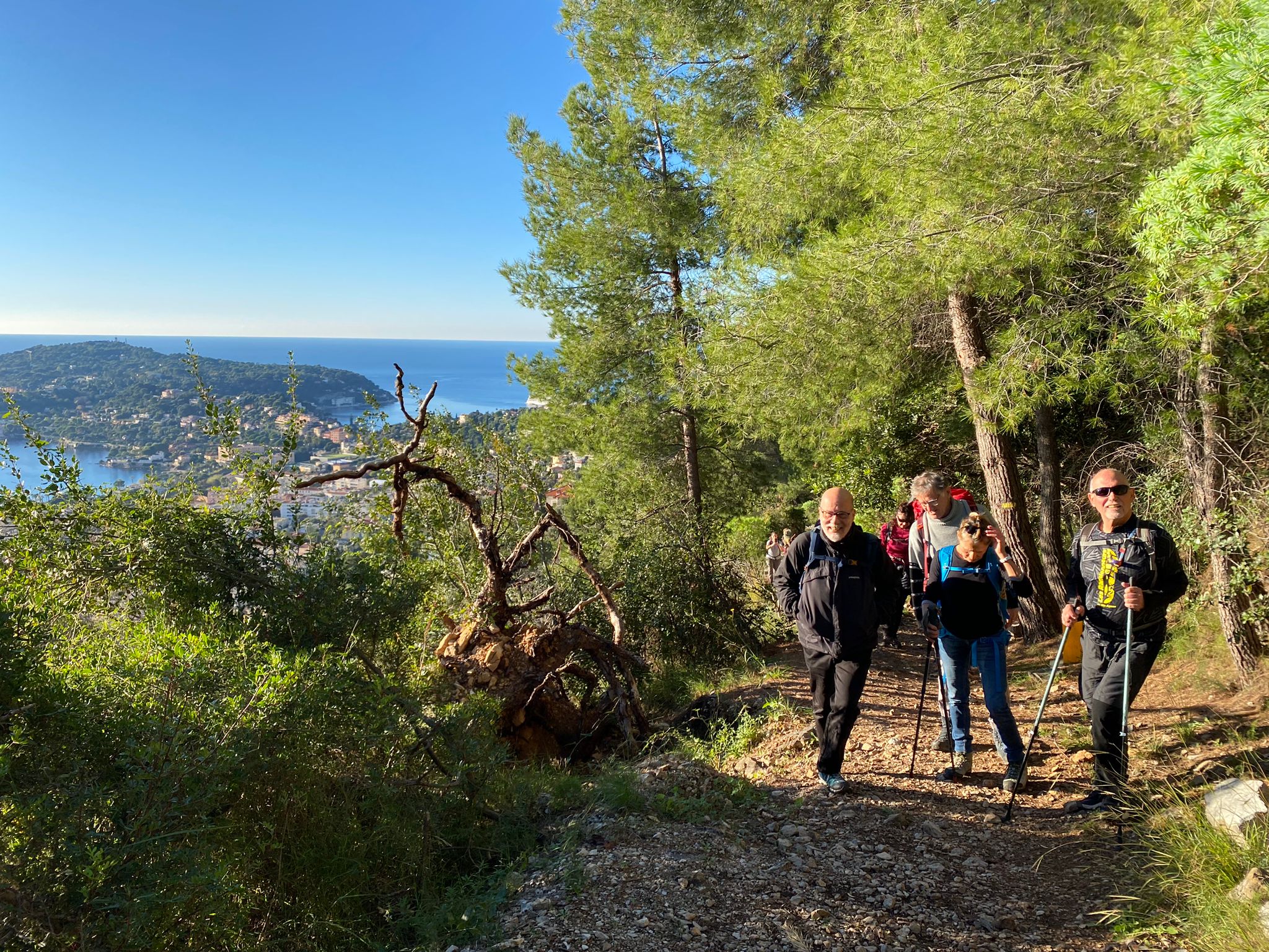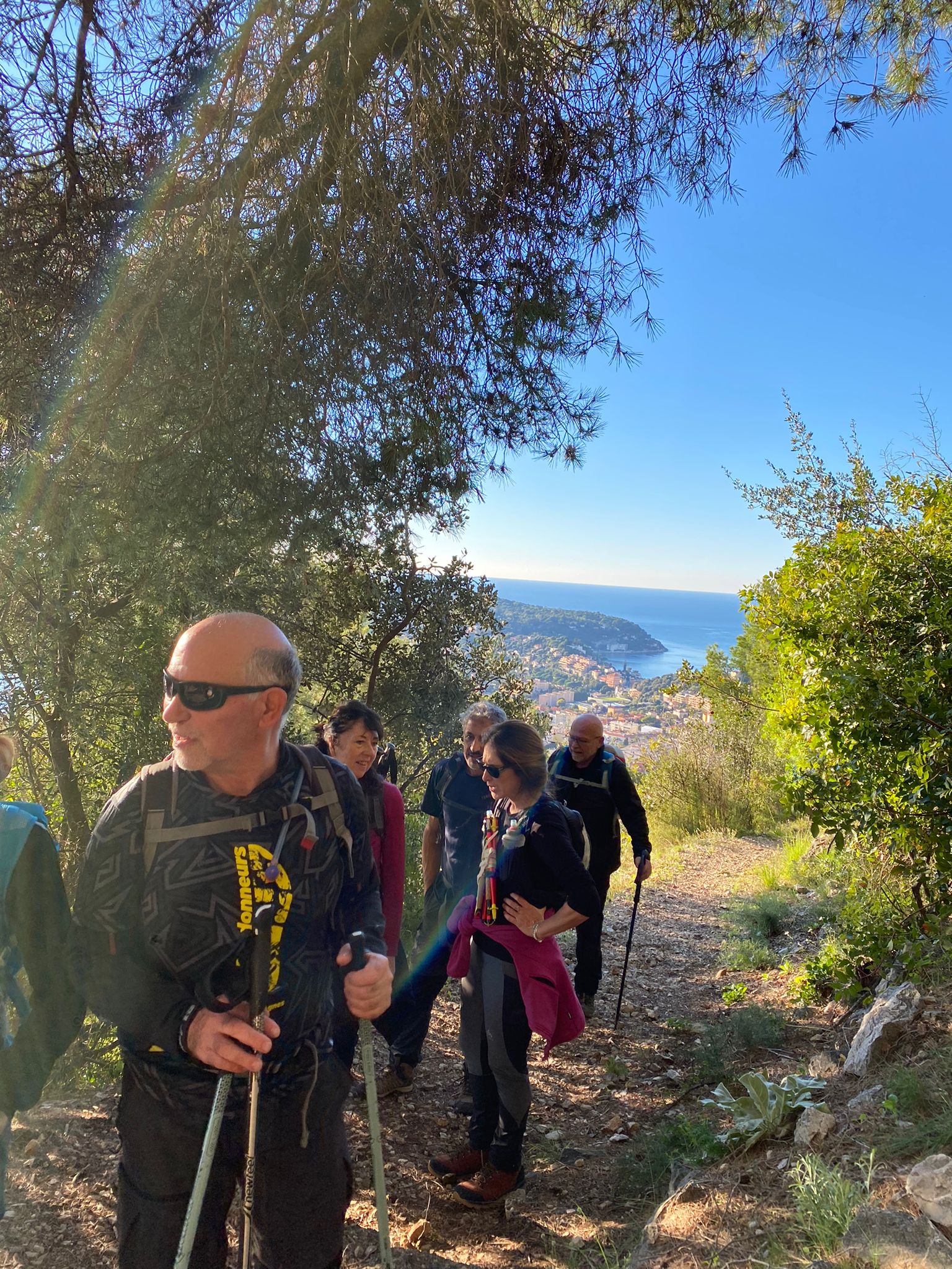 Aujourd’hui, une randonnée d’exception le long des crêtes côtières, tout en escaliers, entre ciel et mer. Certains se sont amusés à les compter : 286, 289… bref, un certain nombre. Sous un ciel bleu sans l’ombre d’un nuage pour troubler la vue, la Méditerranée s’étalait, calme et argentée, scintillant sous les caresses du soleil.Le départ fut donné depuis le charmant village de Beaulieu. Une montée immédiate et exigeante nous attendait, mettant nos corps à rude épreuve, réclamant toute notre énergie et instaurant le silence. Mais, entre deux ascensions, des portions plus douces nous offraient un répit bienvenu, et les échanges ainsi que les rires reprenaient aussitôt, redonnant souffle et entrain à chacun.
