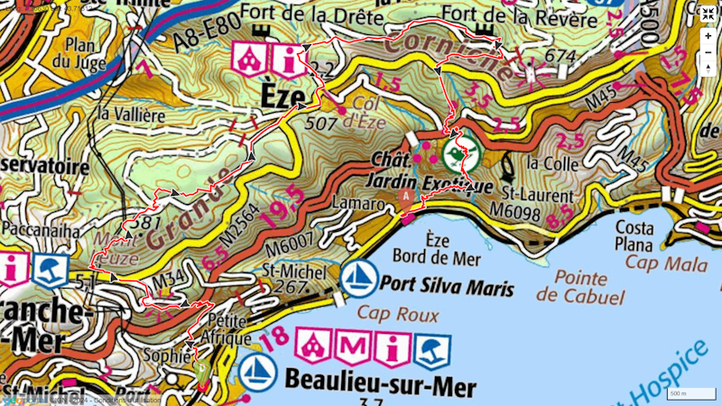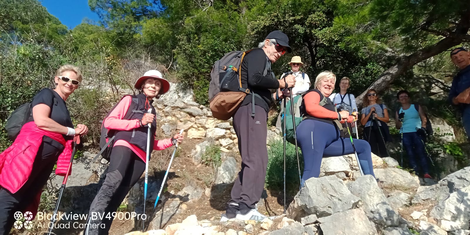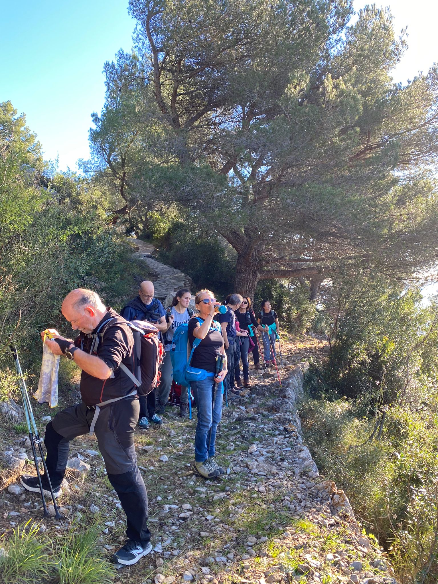 Aujourd’hui, une randonnée d’exception le long des crêtes côtières, tout en escaliers, entre ciel et mer. Certains se sont amusés à les compter : 286, 289… bref, un certain nombre. Sous un ciel bleu sans l’ombre d’un nuage pour troubler la vue, la Méditerranée s’étalait, calme et argentée, scintillant sous les caresses du soleil.Le départ fut donné depuis le charmant village de Beaulieu. Une montée immédiate et exigeante nous attendait, mettant nos corps à rude épreuve, réclamant toute notre énergie et instaurant le silence. Mais, entre deux ascensions, des portions plus douces nous offraient un répit bienvenu, et les échanges ainsi que les rires reprenaient aussitôt, redonnant souffle et entrain à chacun.