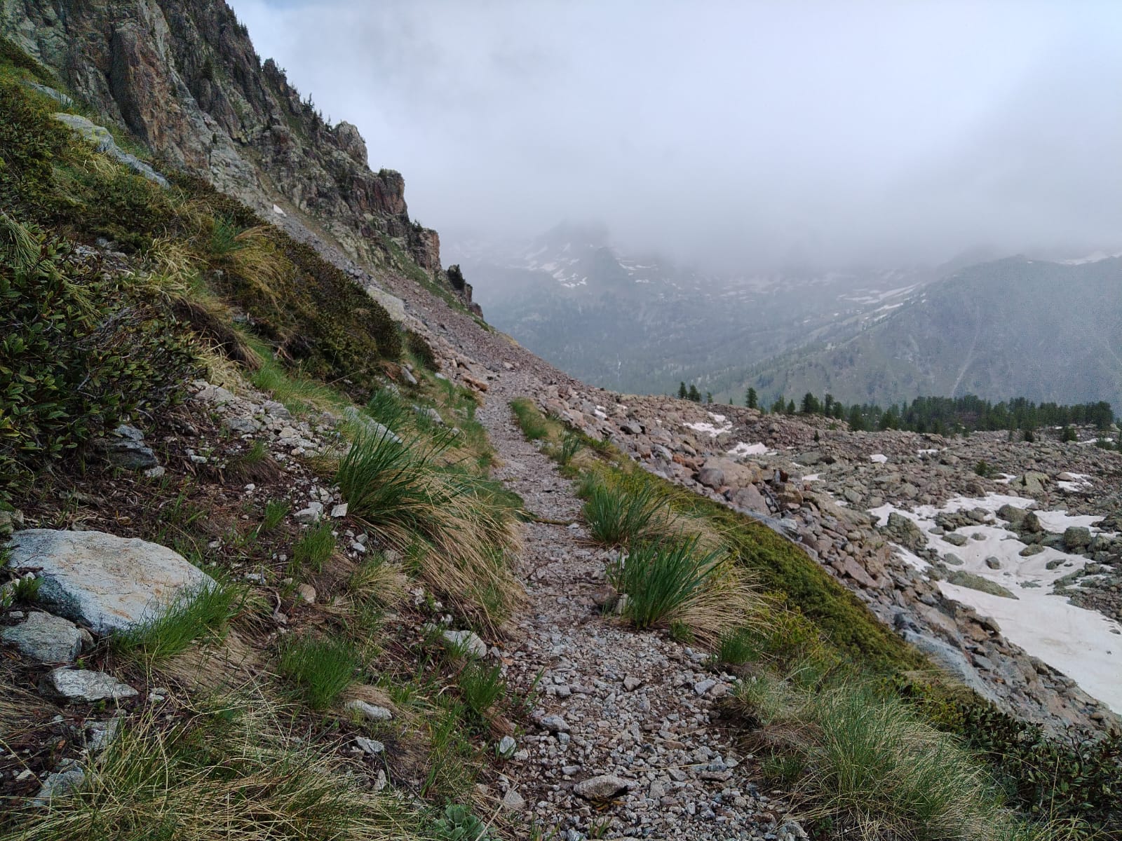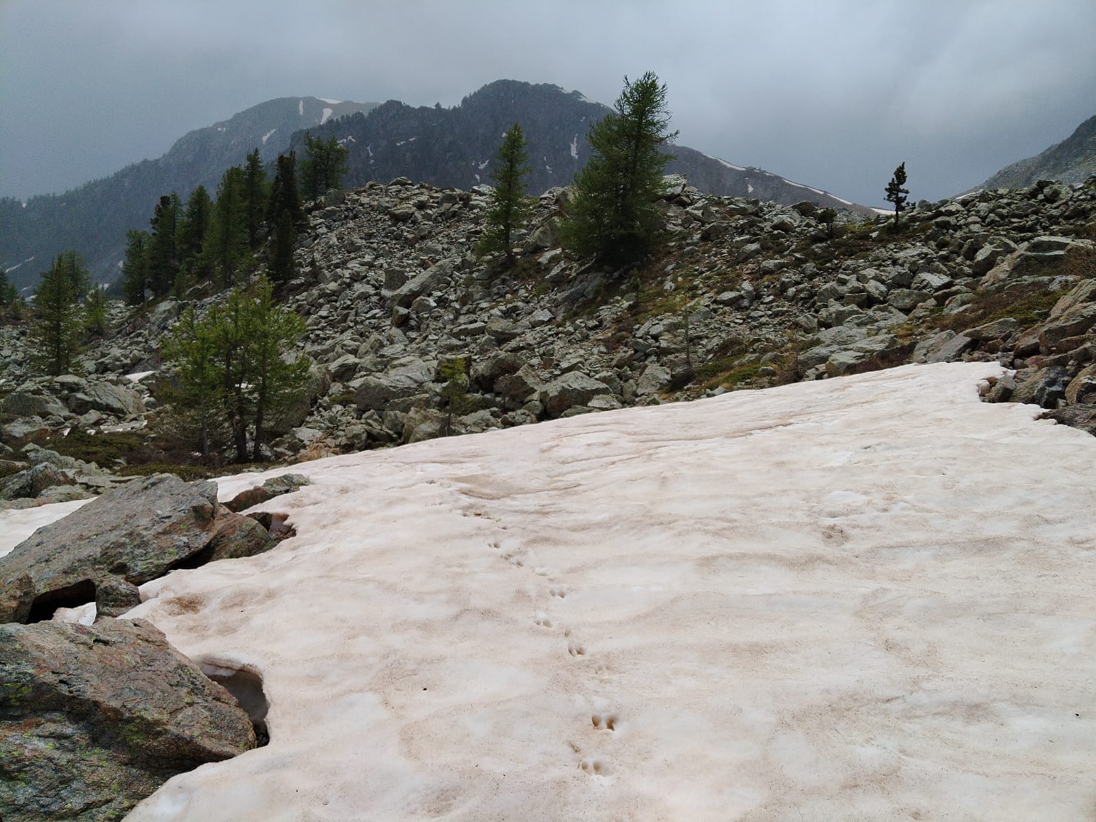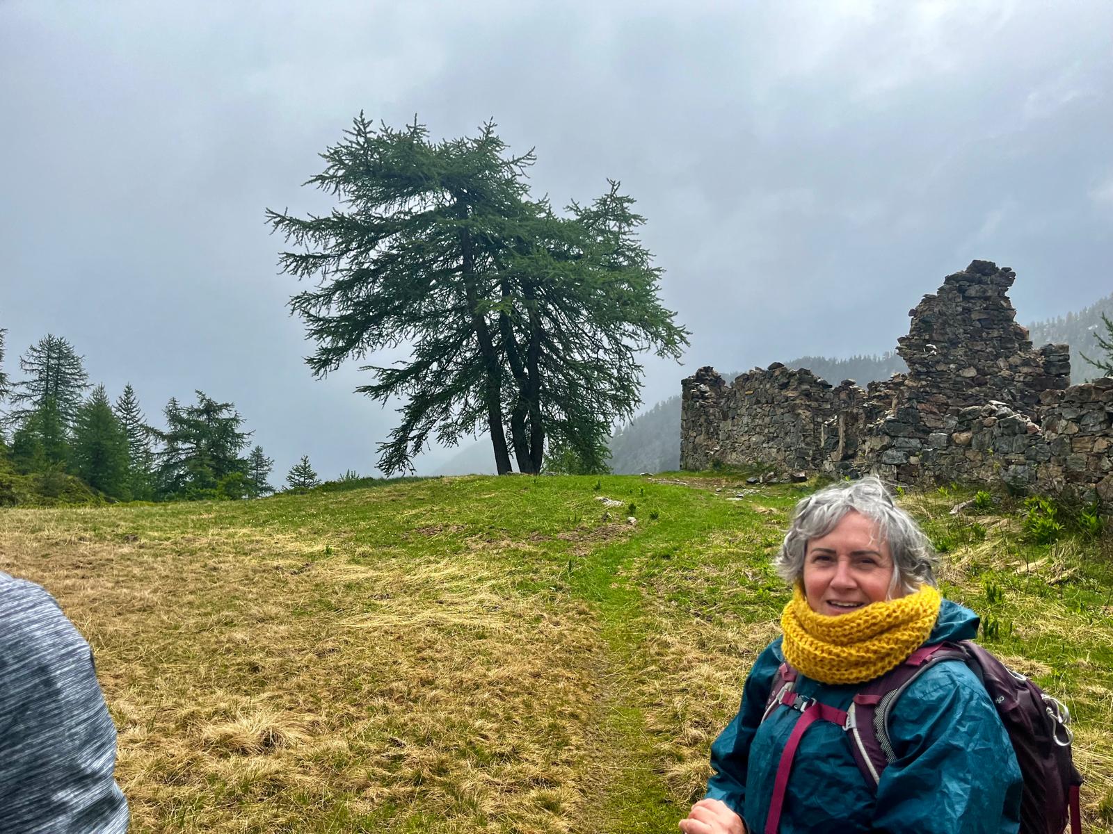 Malgré tout cette piste de montagne parcourt une belle forêt de mélèzes, une végétation de rhododendrons jusqu’au parking. Sur le bas-côté on aperçoit encore les stigmates des différentes tempêtes et des forts vents de l’hiver.
