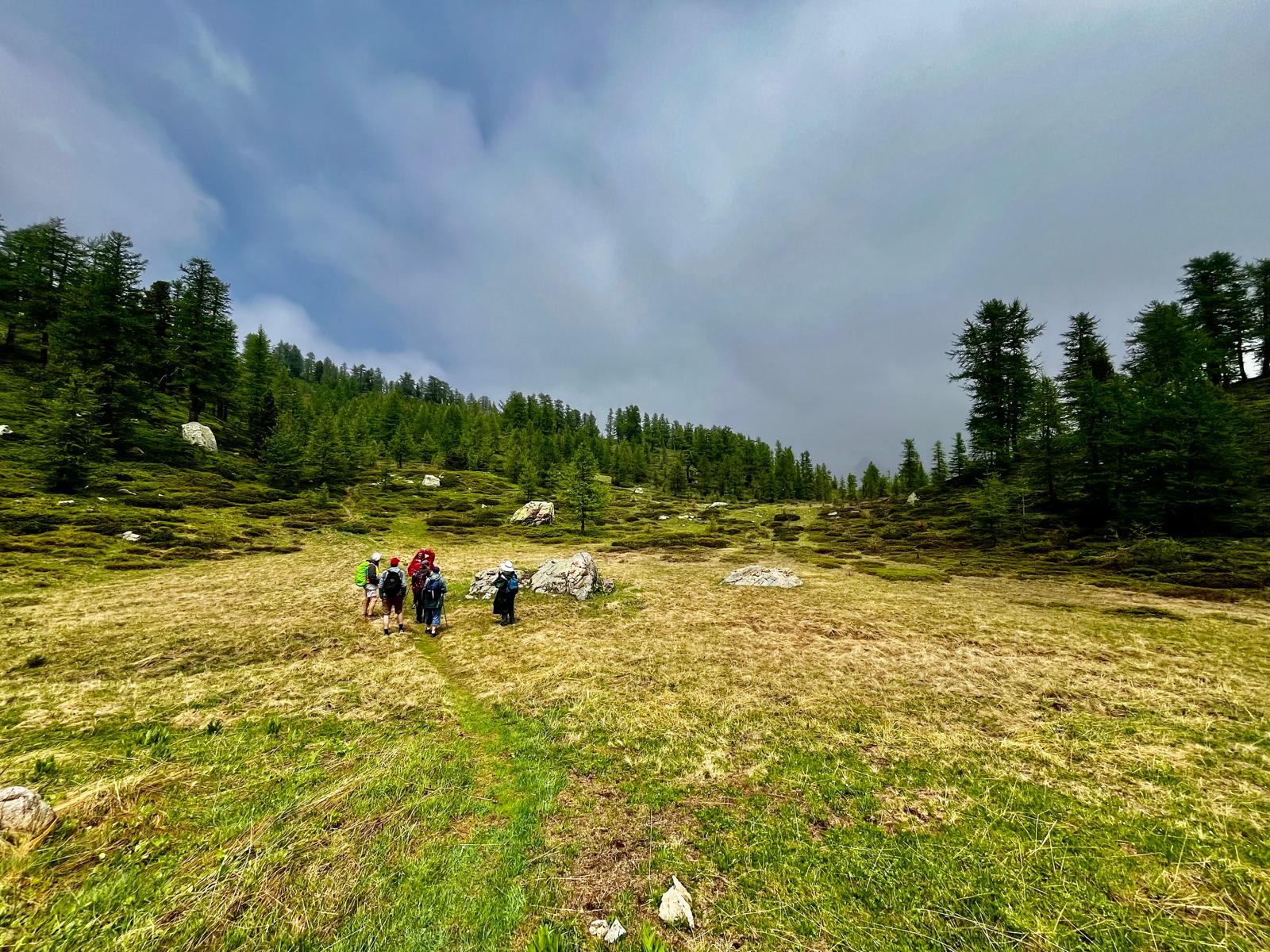 Au croisement des chemins, le groupe des bouquetins a porté son choix sur l’option supplémentaire d’un A/R au col de la Valette. Les quelques gros névés résistants ont ralenti notre progression mais quelle vue à 360° arrivé au col. Avec un vent, une température fraîche et de gros nuages, il a fallu rebrousser chemin rapidement pour retrouver le groupe des marmottes au croisement.