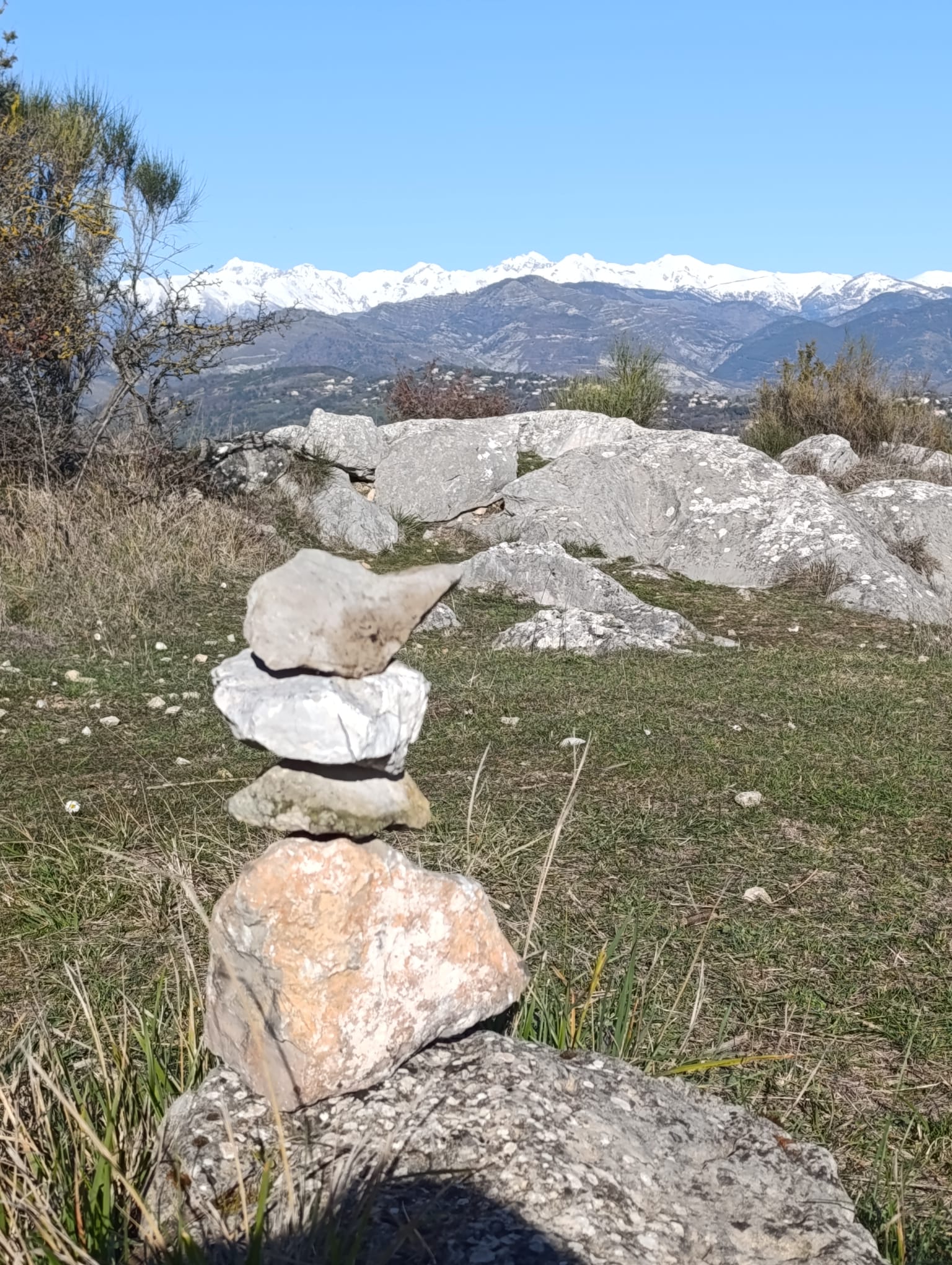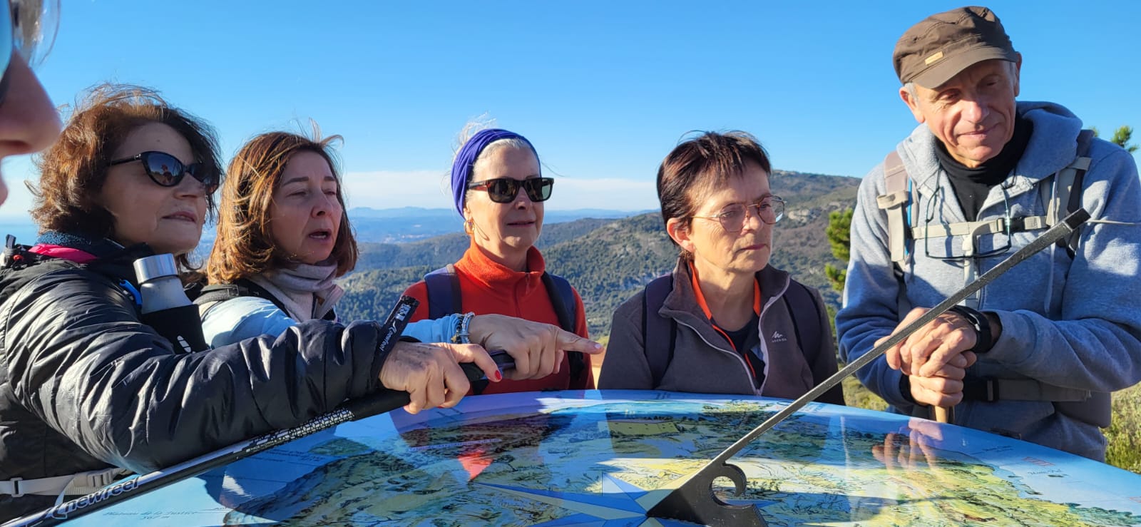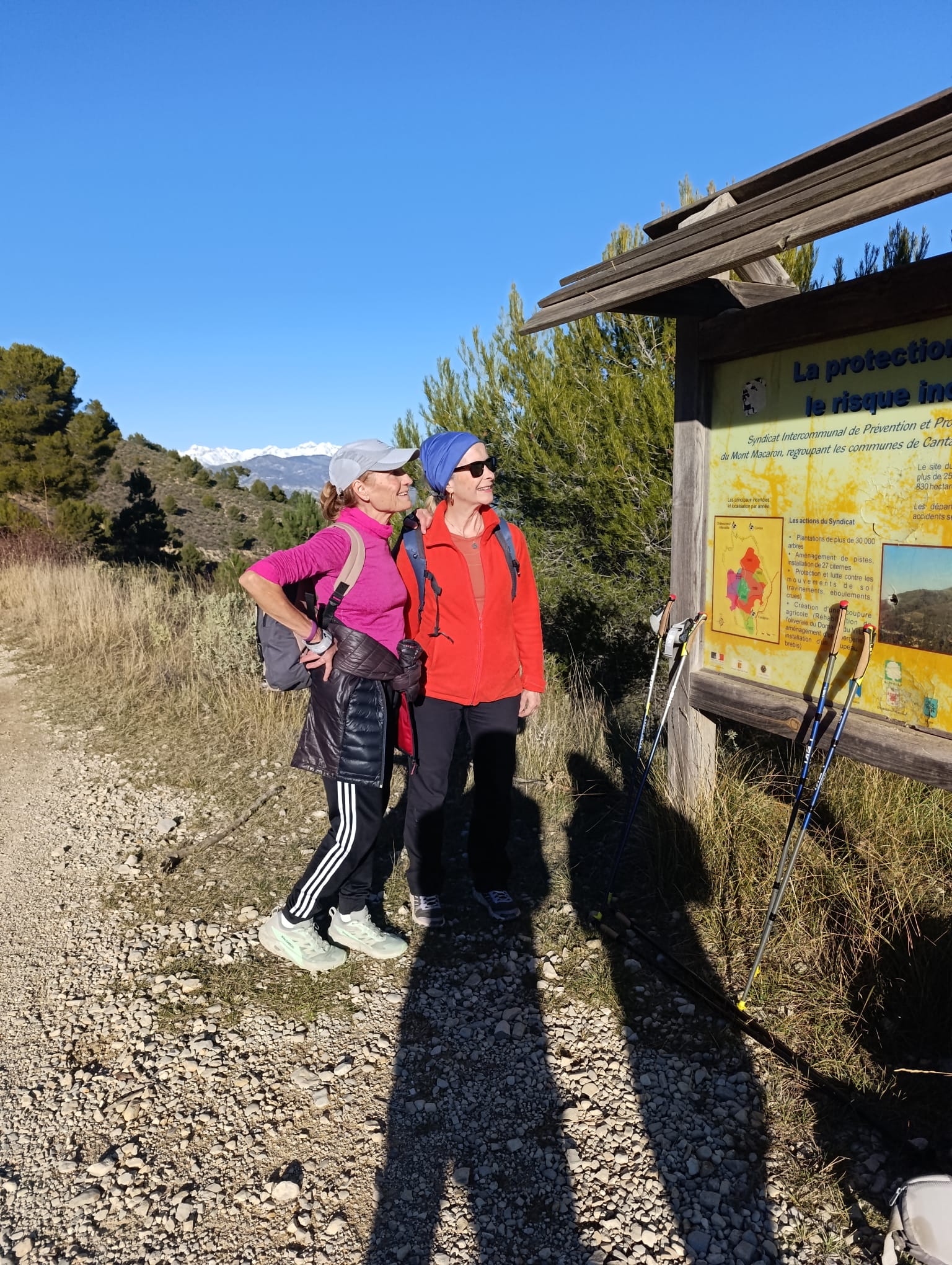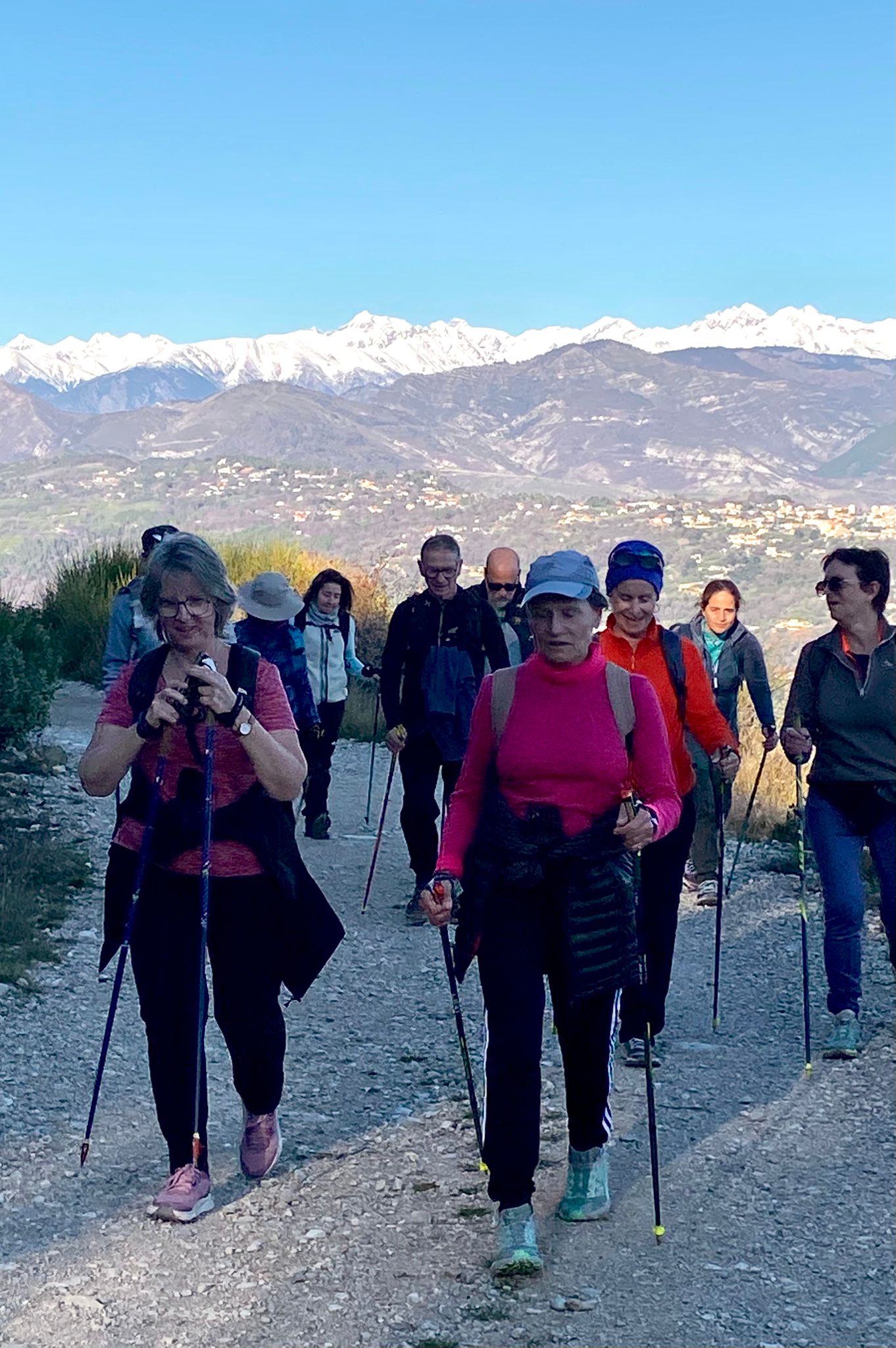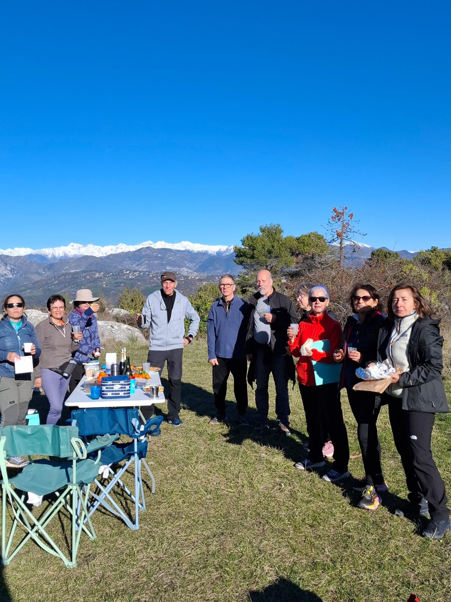 Le Mont Macaron, quel merveilleux lieu pour notre dernière marche nordique de l’année, et quelle splendide journée pour la clôturer en beauté ! Toutes les conditions atmosphériques et climatiques étaient réunies : un soleil étincelant, des couleurs magnifiques sublimant les paysages, des chaînes montagneuses, au loin, revêtues d’un manteau neigeux immaculé, et une mer aux reflets bleus, jaunes et dorés se mêlant harmonieusement.