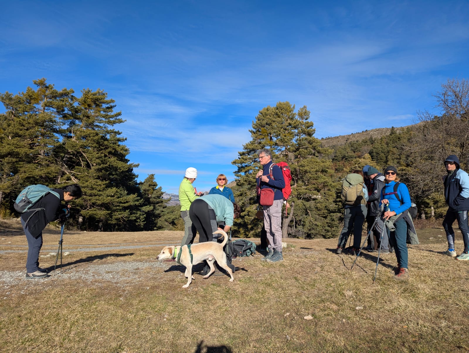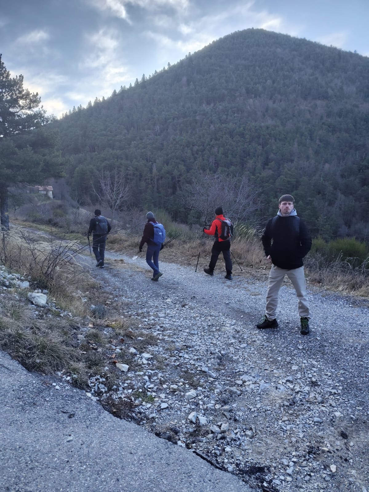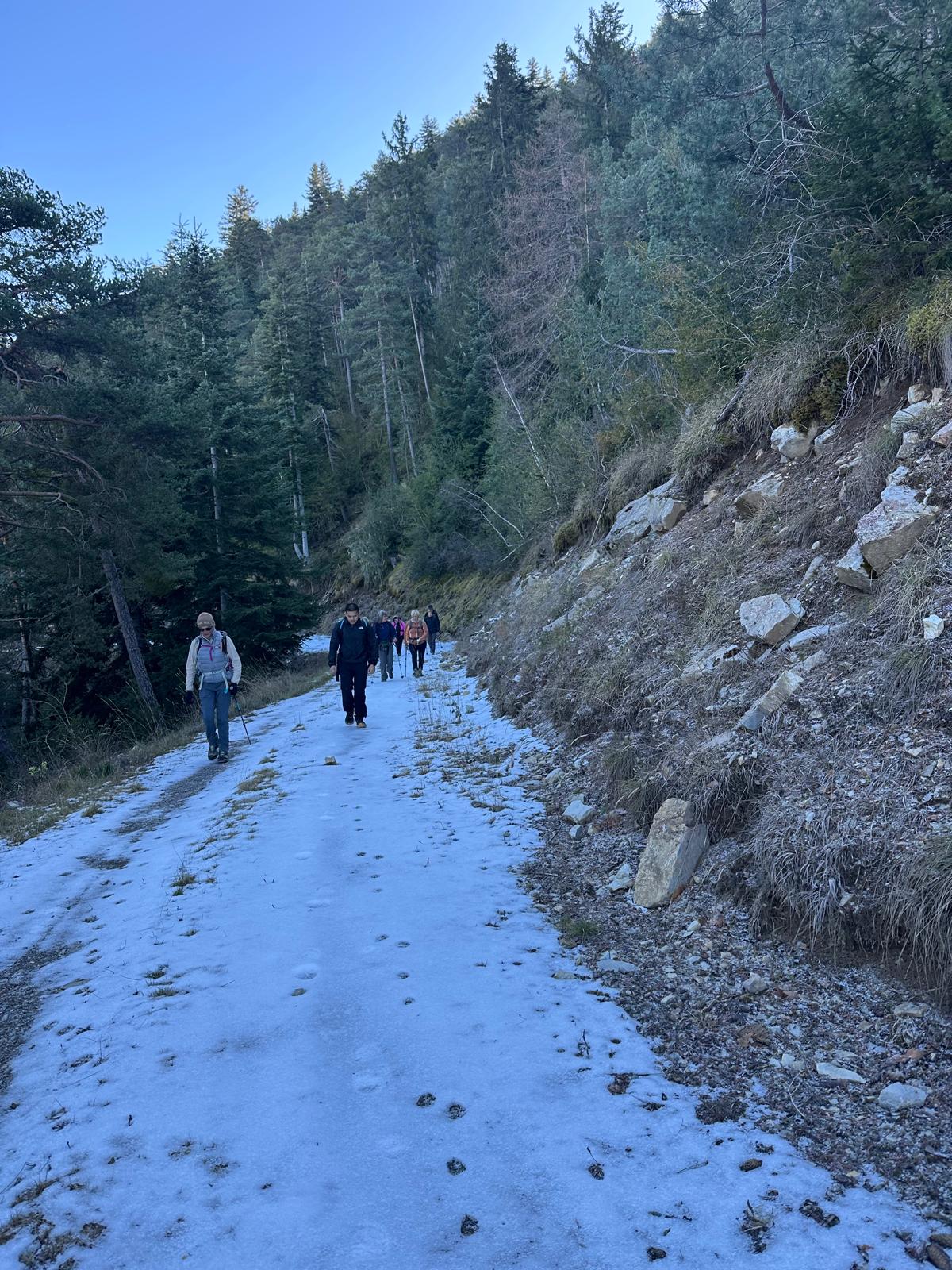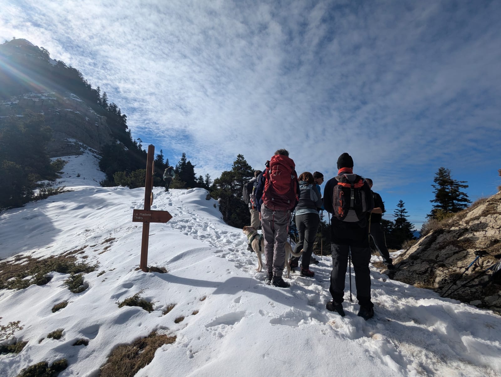 La première étape marquante de notre itinéraire a été le passage au Col de la Madone, situé à 1157 m d'altitude. Point de départ d’un autre groupe du club. Ce col nous a offert une vue sur les montagnes environnantes et nous a permis de profiter d’une première pause. Nous avons pu observer les premiers sommets enneigés en arrière-plan, nous rappelant subtilement que l'hiver ne plaisante pas. Mais rien qui puisse effrayer notre bande de randonneurs aguerris.