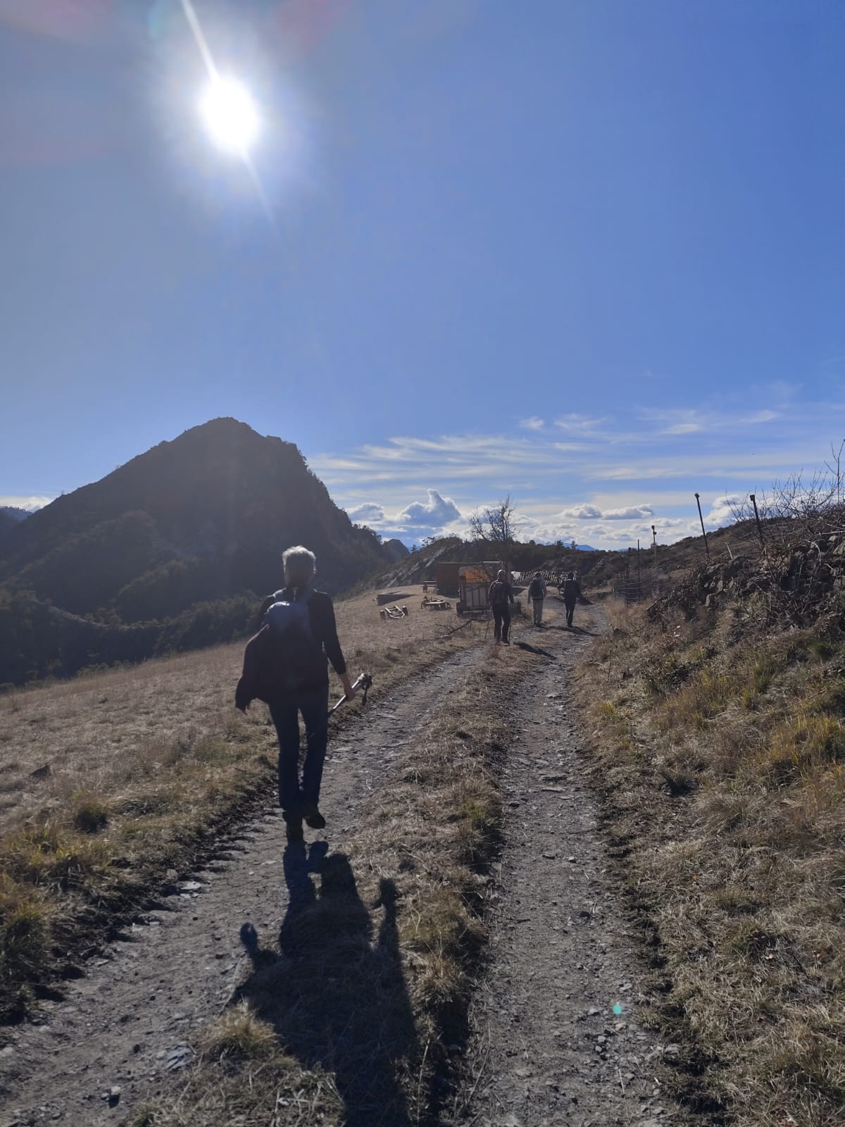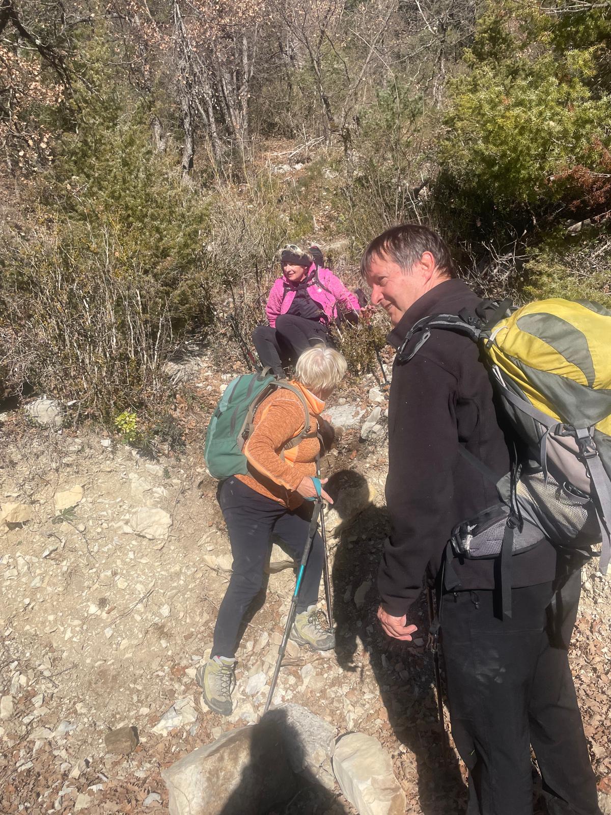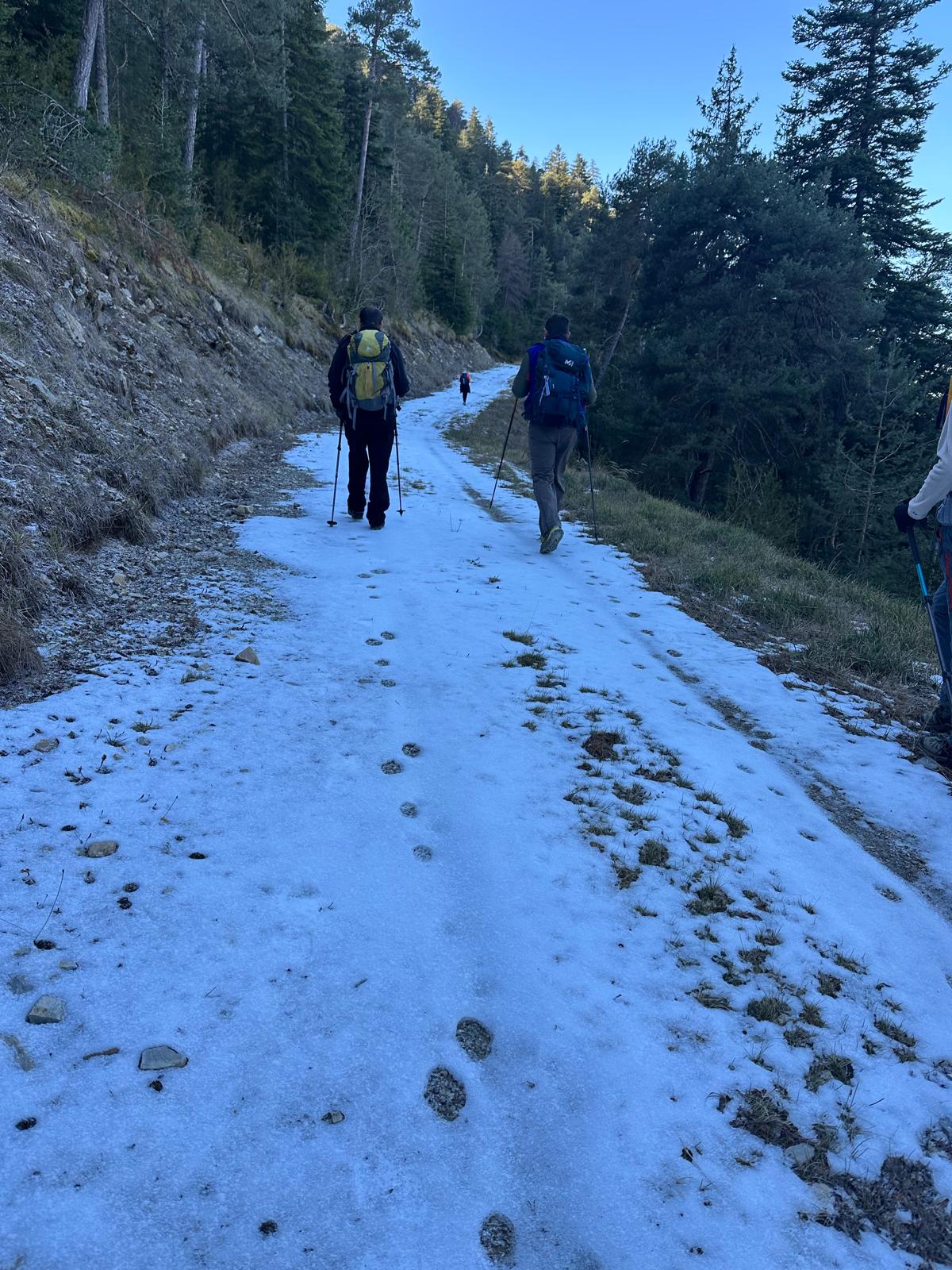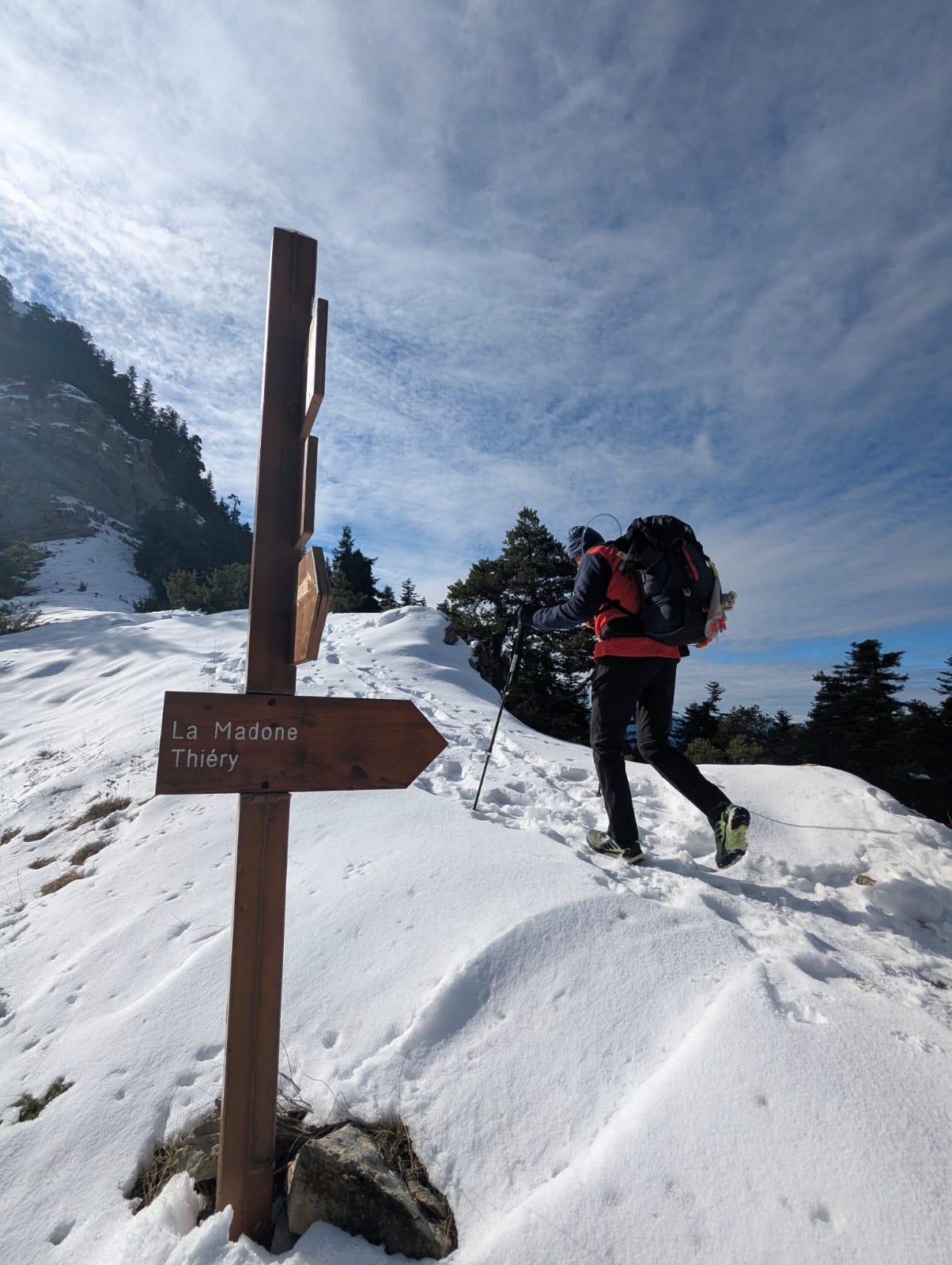 La première étape marquante de notre itinéraire a été le passage au Col de la Madone, situé à 1157 m d'altitude. Point de départ d’un autre groupe du club. Ce col nous a offert une vue sur les montagnes environnantes et nous a permis de profiter d’une première pause. Nous avons pu observer les premiers sommets enneigés en arrière-plan, nous rappelant subtilement que l'hiver ne plaisante pas. Mais rien qui puisse effrayer notre bande de randonneurs aguerris.
