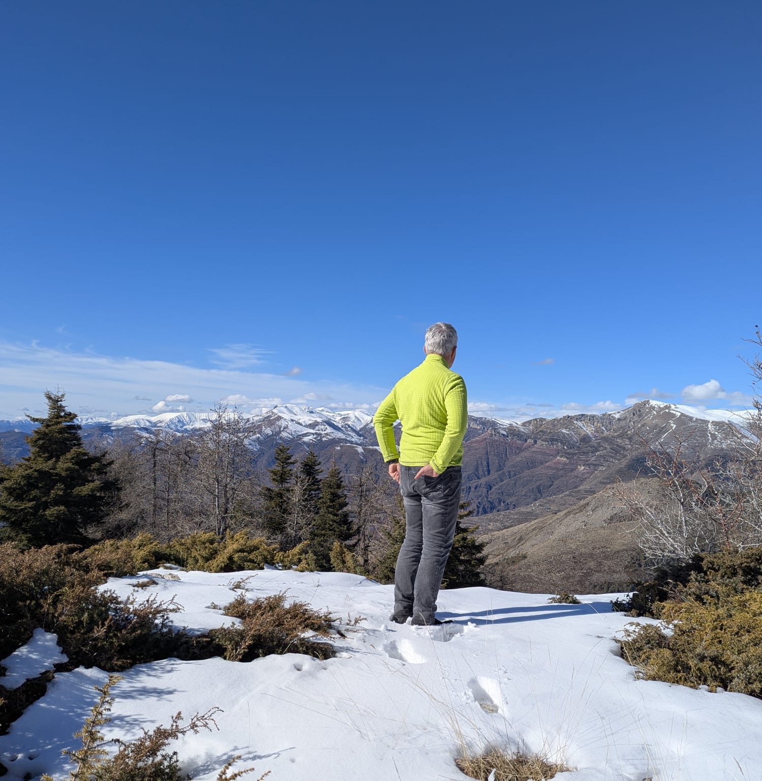 Après le col de la Courbaisse, nous avons quitté les sentiers balisés pour nous engager sur la crête de Briù. Avec de la neige fraîche, nous avons dû ouvrir la trace, ce qui a ajouté un défi supplémentaire à notre progression. Qui aurait cru qu’on se retrouverait à jouer les éclaireurs dans une version alpine de « Koh-Lanta » ? Malgré cela, l’expérience a été immersive et nous a offert des vues imprenables sur les environs. Heureusement, notre groupe est rodé à ce genre de défi et nous avons avancé à bon rythme, malgré quelques passages raides où nos mollets commençaient à protester.