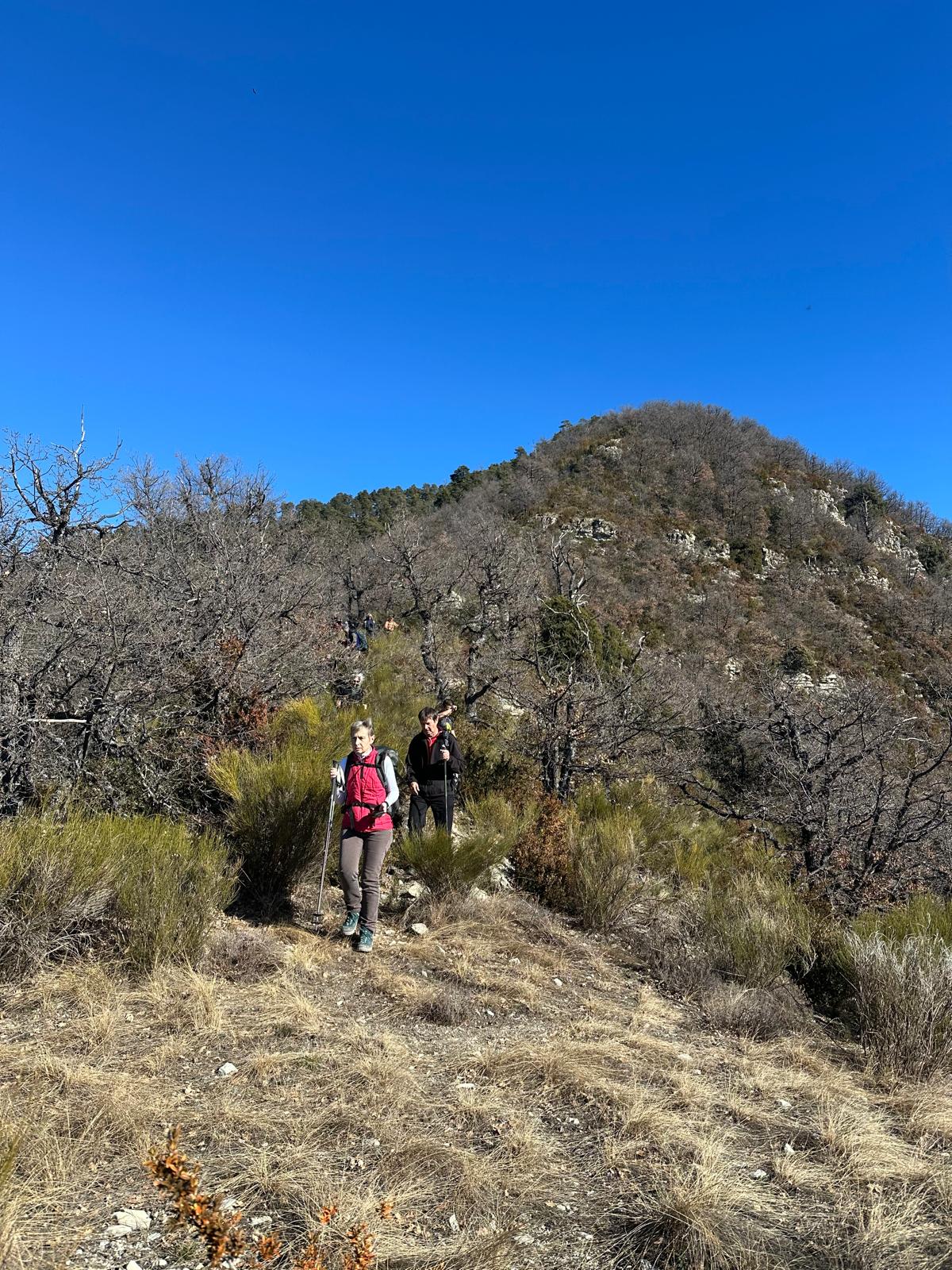 De là, nous avons entrepris l'ascension du Brec d'Ilonse, un sommet offrant un magnifique panorama sur la région, renforçant encore la beauté de notre itinéraire. Nous avons pu distinguer le Mercantour au loin, ainsi que les reliefs escarpés du Haut-Pays niçois. Tout était parfait… sauf peut-être ces muscles qui commençaient à sérieusement protester. Mais fidèles à notre réputation, nous avons tenu bon, motivés par la perspective d’un retour en beauté.
